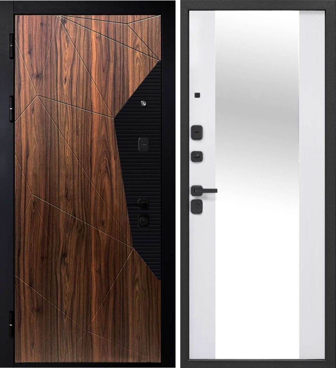 Входная дверь 9 см мдф/мдф Геометрия МДФ Орех Каньон Коньяк - Эмалит белый Зеркало — купить в Омске по цене 35 000 руб. — RosDoor (Сталь-сервис)