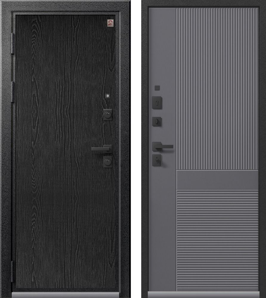• Снаружи металл дополнительно защищен внешним МДФ-щитом 10 мм черного оттенка "Распил графит", который придает двери свою уникальность и достигается максимальная шумоизоляция;